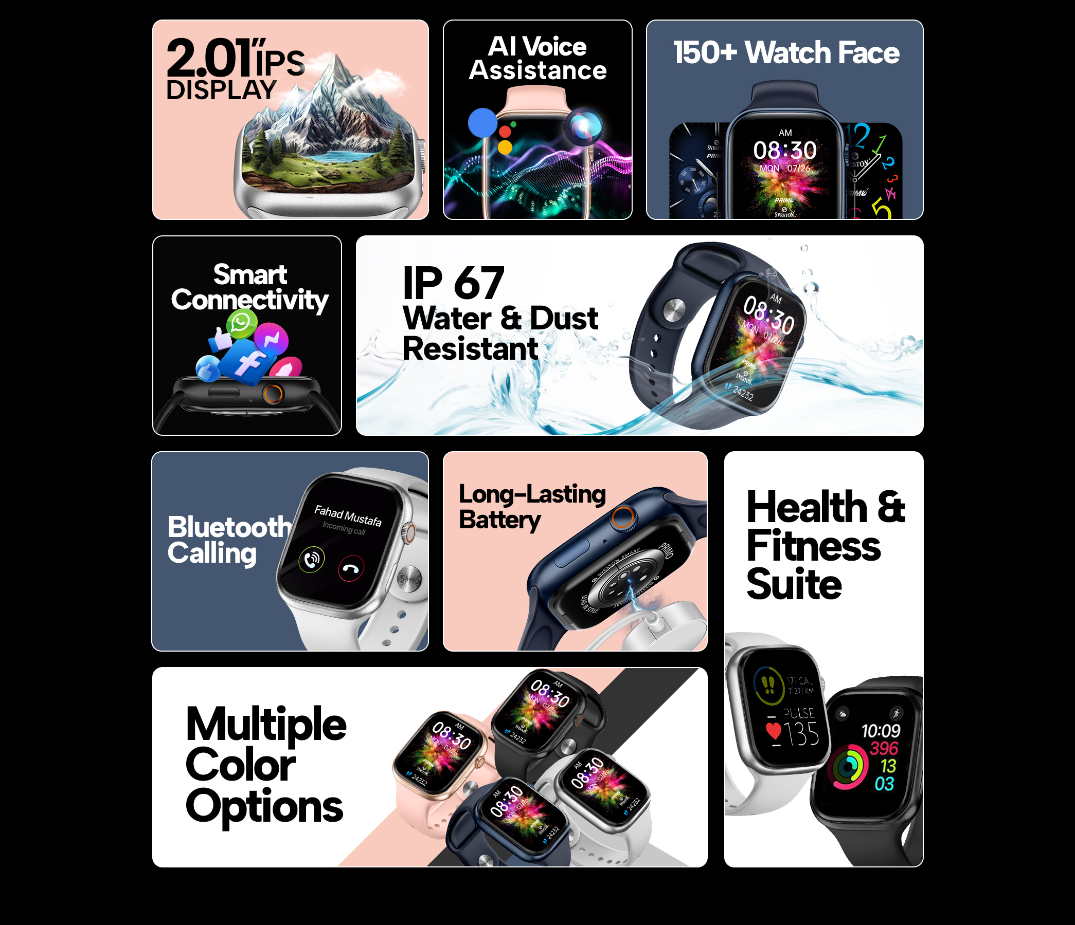- Design and Compatibility: The smartwatch combines premium materials and stylish design with practical features, compatible with both Android and iOS smartphones.